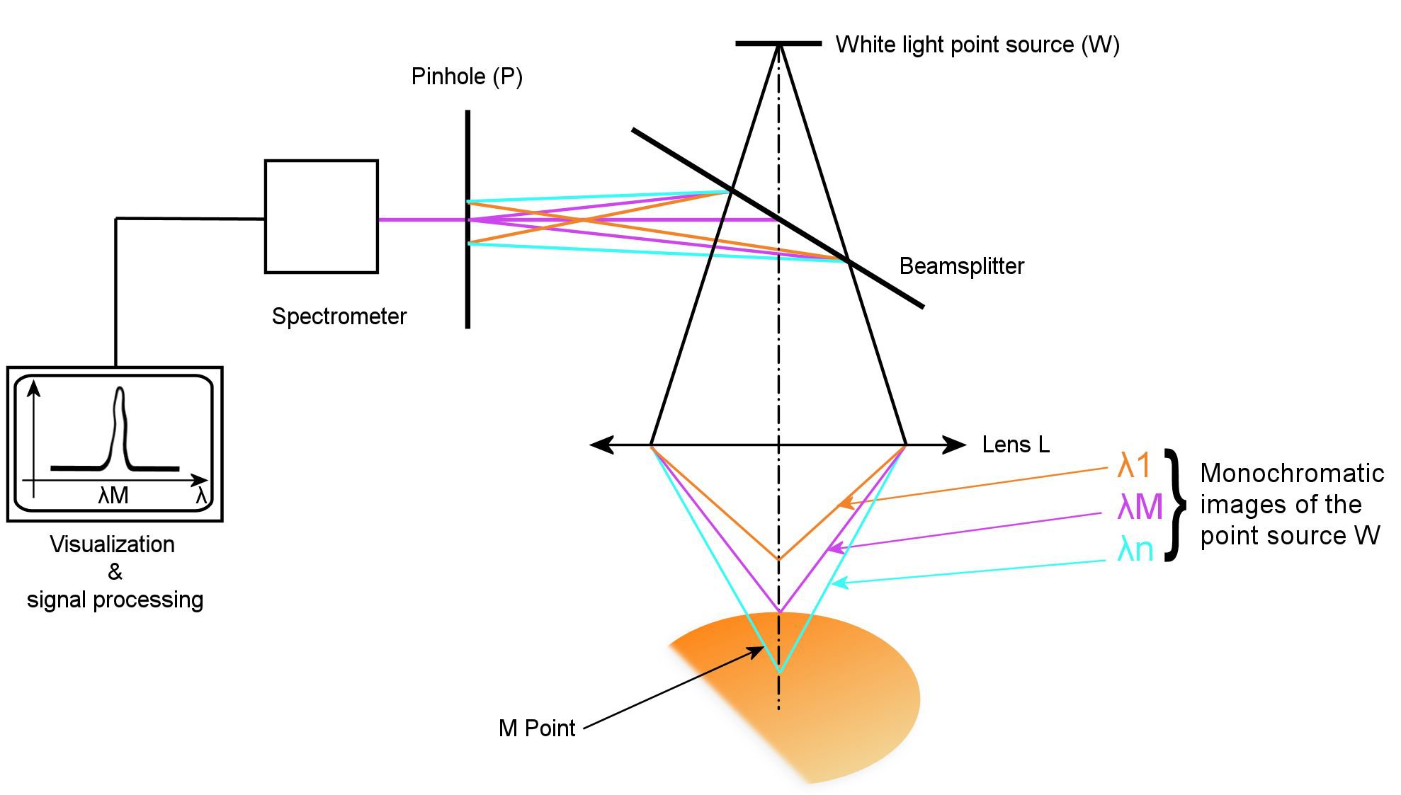 Backscattered light through the lens colour L in the opposite direction and arrives at a hole P that filters all wavelengths except one, λM.