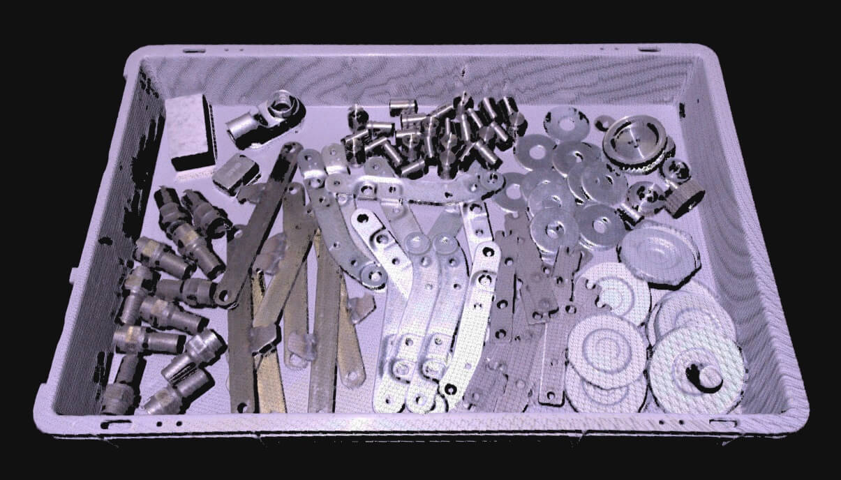 Zivid Two is ultra-compact with a small baseline and more optimal occlusion performance than larger baseline cameras and scanners. A large baseline gives excessive projector/camera shadowing and loss of scene details, creating holes, and missing data affecting the detection. There's also a risk of missing smaller objects hidden by shadows in the bin, for example, close to corners and edges, especially when picking from smaller boxes.