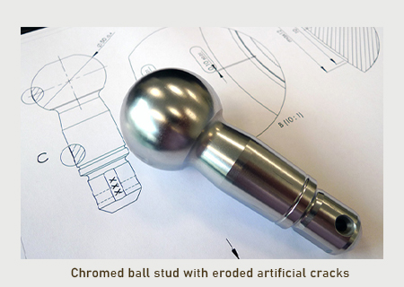 Notches and dimples with defined depth as per your requirement are inserted in your test parts by the erosion process for verification of the sensitivity of a crack detection. If your customer desires the master parts can be measured in an accredited laboratory and you will receive the parts together with the certificate. Master parts which are regularly tested are naturally subject to high wear. We offer a chromium-plating of the master parts as option which increases the lifetime without affecting the eddy current result.